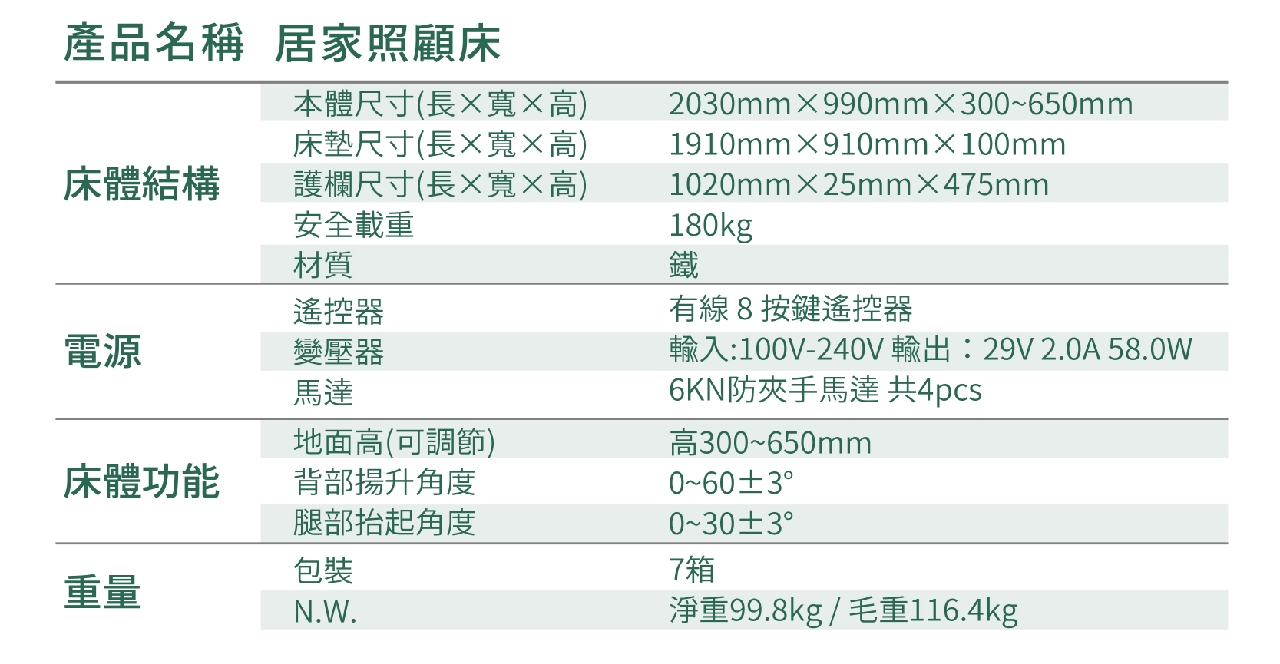 N.W. / G.W. | 淨重99.8kg/毛重116.4kg |