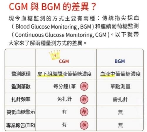 連續葡萄糖監測系統 (CGM) 是在使用者身上配載一個感測器,經由感測器探頭量測皮下組織液中的葡萄糖。